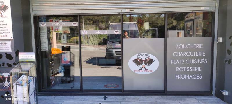 Récemment, la boucherie Tanzili à Bandol (Var) a fait confiance à Decograph pour la création et la pose d’adhésifs publicitaires sur ses portes vitrées. Ce projet a débuté par la conception d’une maquette sur mesure, réalisée en étroite collaboration avec le client afin de respecter son identité visuelle et ses besoins de visibilité.