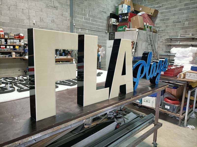 Nous avons dans un premier temps dû réaliser deux chassis sur mesure à la forme arrondie et laqués en blanc selon les souhaits du client. Les Lettres reliefs ont été conçues en plexi diffusant, avec les faces lumineuses et chants opaques (hauteur des lettres FLAMENCO 60 cm, Plage environ 40 cm). Les lettres ont ensuite été minutieusement fixées sur le chassis pour le rendu escompté par le client.