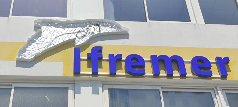 Le texte IFREMER a été réalisé en lettres boitiers plexi avec chants et dos laqués (relief des lettres de 120mm), hauteur des lettres 70 cm et éclairée intérieurement par des leds.