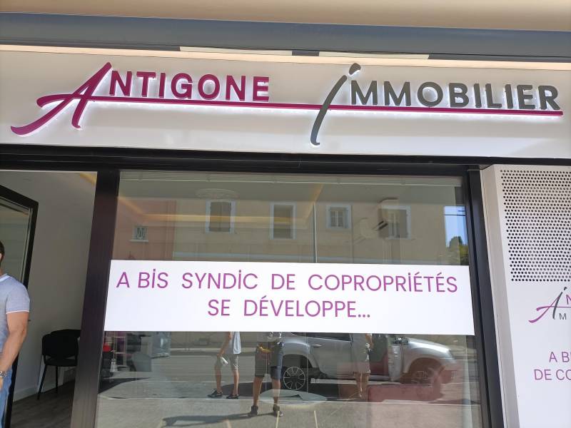Notre client L'agence immobilière Antigone à Sanary sur mer nous à confié la fabrication de son enseigne commerciale. Tout en respectant leur charte graphique, couleurs, typographie, dimensions, matières et rendu global, nous avons fabriqué dans notre atelier de six fours aux playes, leur enseigne. L' enseigne est en lettres reliefs pvc 19mm laquées selon leur pentone ou RAL, retro éclairées par leds blanches posées avec entretoises sur un coffrage gris qui cache le rideau métallique, que nous avons également