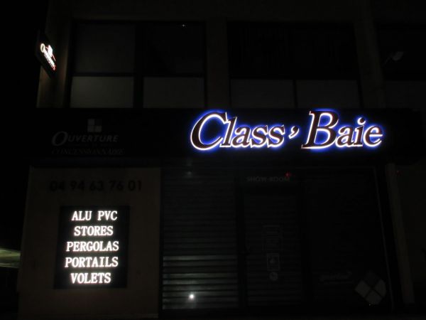 Notre client Class Baie, spécialiste des aluminiums, stores, pergolas et portails à Six Fours les plages près de Toulon dans le Var nous a confié la réalisation de son enseigne lumineuse ainsi que la réalisation de sa signalétique. Nous l'avons orienté vers un caisson en dibon avec lettres en PVC rétro éclairées pour la partie haute avec des adhésifs de découpe pour le logo. Pour renforcer la visibilité de son entreprise nous avons réalisé un deuxième caisson lumineux avec des lettres ajourées, éclairées.