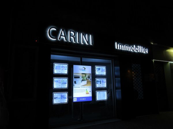 En respectant la charte graphique et les souhaits de notre client, l'agence CARINI à Six Fours dans le Var, nous avons dans un premier temps réalisé tout l'habillage de la façade extérieure à l'aide de dibon que nous sommes venus plaquer sur toute la surface. Le nom et le numéro de téléphone ont été réalisés en lettres PVC teintées, fixées à l'aide de taquets de déport pour créer un relief de jour et permettre l'insertion d'un rétro éclairage la nuit.