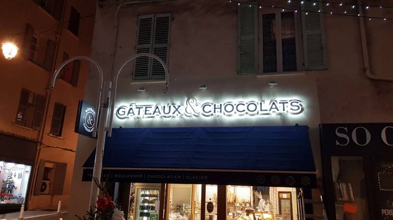 Décograph, spécialisé dans la conception et la pose d'enseignes lumineuses dans le Var et sa région vous accompagne dans tous vos projets de signalétique. Notre activité va de la conception de signalétique, plaques murales au marquage sur tous supports de communication y compris vos véhicules. Vous trouverez ci dessous la réalisation de l'enseigne lumineuse pour Gâteaux et Chocolats, au Mourillon, à Toulon dans le Var.