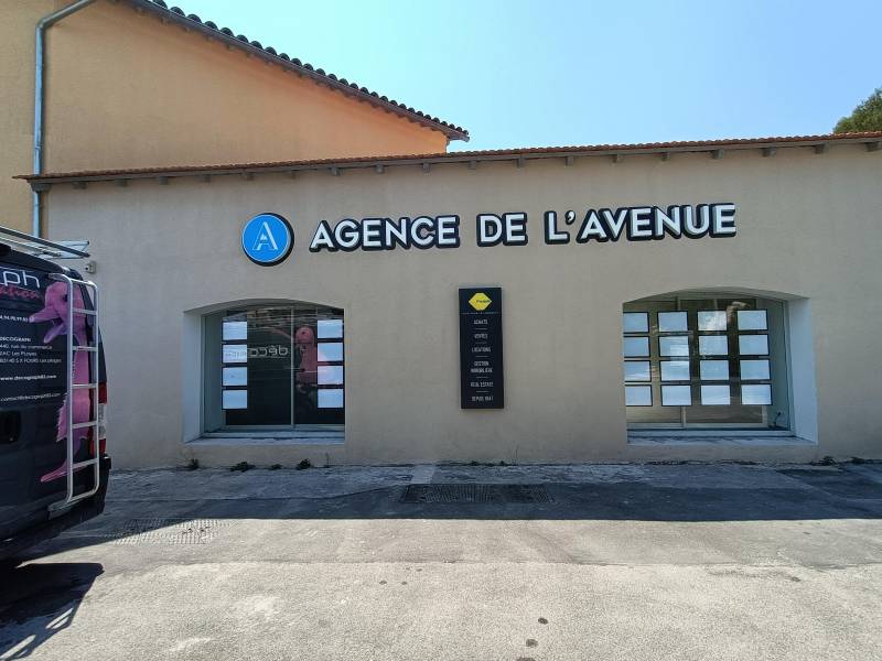 Décograph, votre spécialiste dans la création, la fabrication et la pose d'enseignes commerciales et autres panneaux publicitaires dans le Var est ravi de vous présenter sa dernière réalisation pour l'agence immobilière l'Agence de l'Avenue aux Sablettes à la Seyne sur mer dans le Var.