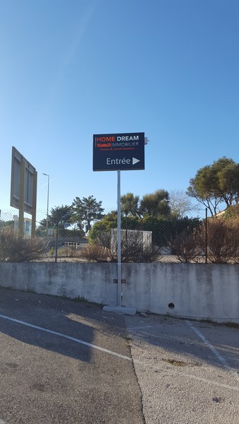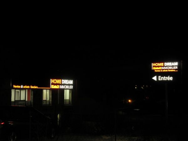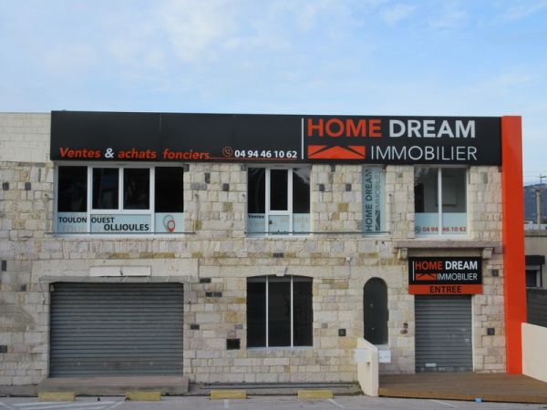Notre client Home Dream Immobilier est un nouveau concept d'agence immobilièr accès sur la transaction foncière à Six fours les playes proche de Hyères. Pour le lancement de cette agence, nous avons conseillé notre client Home Dream sur un caisson tôle tablette en lettrage ajouré avec face plexy blanc diffusant et adhesif orange diffusant plus habillage en dibon orange d'une goutière de 8m, adhésif en vitrophanie.