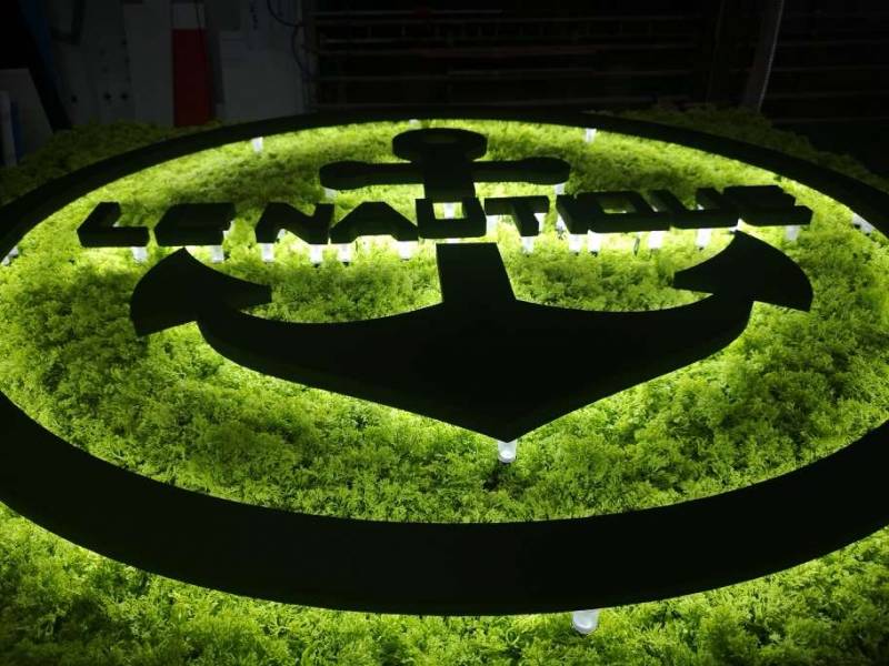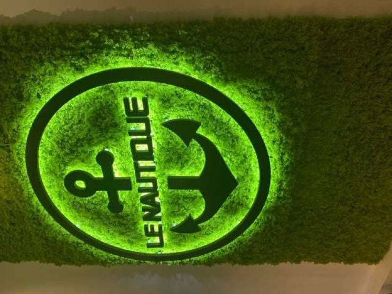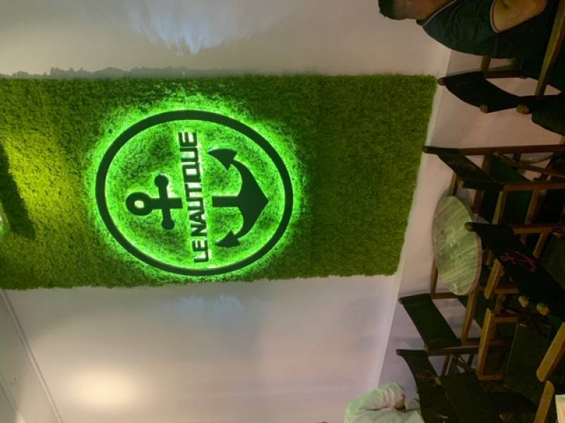Le client a au préalable choisi un gazon synthétique vert. Le mur a été habillé avec ce gazon puis nous avons fixé une tole tablette en dibon recouverte de gazon sur laquelle l'enseigne logo a été conceptualisé puis découpé en PVC épaisseur 19mm.Des leds ont été fixées à l'intérieur du logo préalablement évidé. Ce système permettant de cacher tous les fils électriques et donner un rendu impeccable.