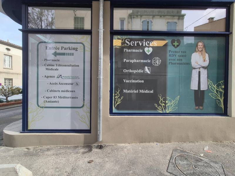 Dans le cadre de ce projet, nous avons réalisé un habillage de vitrine en film micro-perforé pour une pharmacie à La Seyne-sur-Mer (83500). L’objectif était de moderniser la façade de la pharmacie tout en améliorant la visibilité de l’établissement et en créant un support de communication attractif pour les passants.