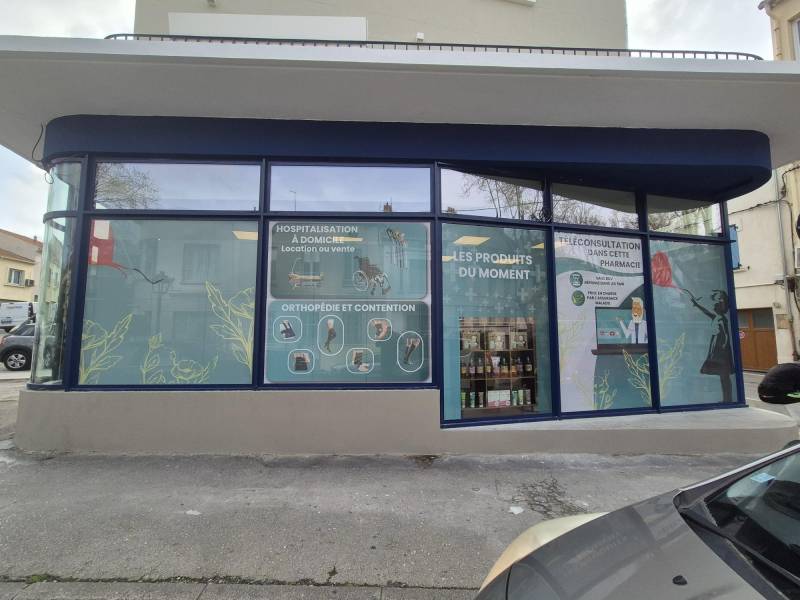 Pour cet habillage de vitrine de pharmacie à La Seyne-sur-Mer, notre équipe a réalisé l’ensemble du projet : création graphique, fabrication du film micro-perforé, impression haute définition et pose sur site.