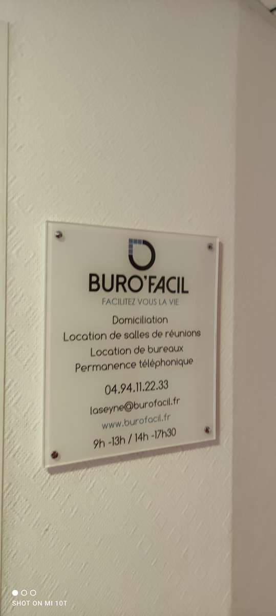 Pour notre client BURO FACIL, nous avons réalisé une cloison occultante partielle grâce à un adhésif dépoli découpé au format pochoir avec le logo fourni par le client (vectorisé pour une découpe précise). L’adhésif a été posé sur toutes les vitrines et sur la fenêtre de l’accueil pour garantir à la fois intimité et visibilité. Une plaque professionnelle en plexiglass avec impression en vitrophanie a également été installée à l’entrée, renforçant la visibilité de l’entreprise. Ce projet illustre parfaitement notre savoir-faire dans la création de signalétique sur-mesure, adaptée à chaque espace professionnel dans le Var.